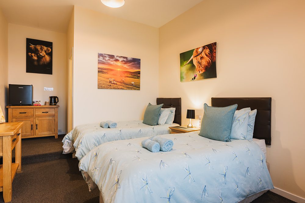 We have three spacious en suite twin rooms with tea and coffee facilities and a small fridge in each room. We do not serve breakfast, however, we can deliver breakfast rolls in the morning from our sister property ‘ The Trout Fly ‘. We can also provide a full Scottish breakfast at the Trout Fly which will be included in the price quoted for direct bookings.
